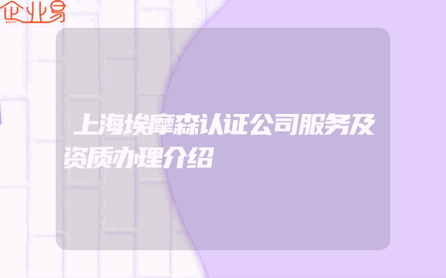 - 上海埃摩森认证公司服务及资质办理介绍一、埃摩森认证公司介绍埃摩森认证公司作为一家专业的企业服务机构,长期致力于为企业提供全方位的认证服务。公司拥有一支专业的团队,熟悉各类企业资质办理政策,能够为企业提供高效、专业的咨询服务。二、服务内容埃摩