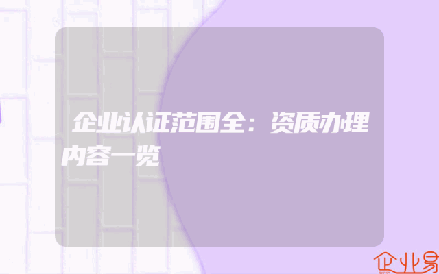 - 企业认证范围全解析:资质办理内容一览一、企业认证的重要性在当今竞争激烈的市场环境下,企业认证已成为企业发展的重要保障。企业认证不仅提升了企业的信誉度和市场竞争力,更是企业规范化、标准化运营的必要手段。不同的企业认证涉及不同的资质办理,这些资