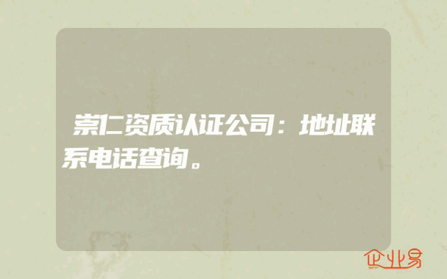 - 崇仁资质认证公司:地址、联系电话查询及相关服务解析一、公司概况崇仁资质认证公司作为业内知名的企业服务提供者,专注于为企业提供各类资质认证服务。该公司具备丰富的经验和专业的团队,能够为企业提供高效、便捷的资质办理服务。二、公司地址及联系方式为