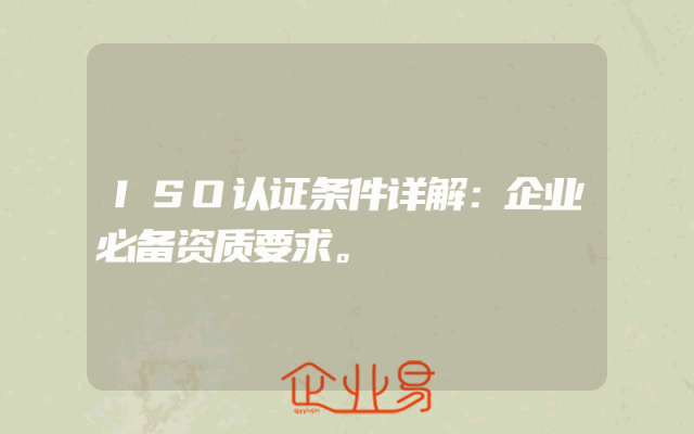 - ISO认证条件详解:企业必备资质要求一、ISO认证概述ISO认证是国际标准化组织(ISO)对企业管理和产品质量的认证,旨在提高全球企业的管理水平和服务质量。随着市场竞争的日益激烈,越来越多的企业开始重视ISO认证,以提升自身的核心竞争力。二