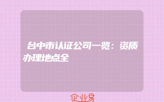 - 台中市认证公司一览:资质办理地点全解析一、台中市认证公司的概述台中市作为经济发展较为活跃的城市之一,汇聚了许多专业的认证公司。这些公司致力于为企业提供全方位的资质办理服务,助力企业顺利运营和发展。本文将详细介绍台中市各大认证公司的资质办理地