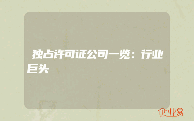 - 独占许可证公司一览:行业巨头解析一、独占许可证公司的概念及其重要性独占许可证公司,指的是那些拥有特定行业资质、执照和许可的公司,它们通常拥有行业的独家经营权或某种特定优势。这类公司在市场经济中占据重要位置,是行业发展的引领者和标杆。它们不仅