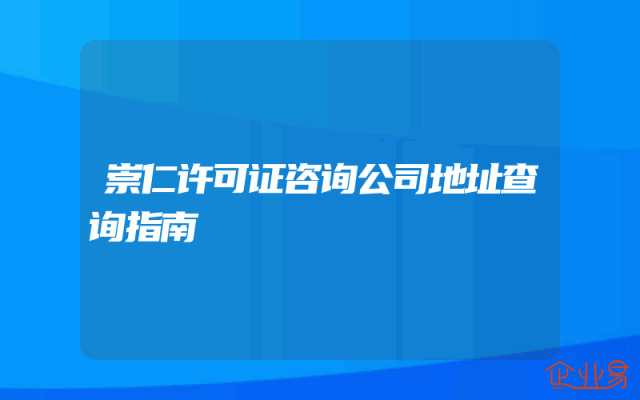 - 崇仁许可证咨询公司地址查询指南一、引言随着企业运营和日常商业活动的规范化,越来越多的企业和个人需要办理各类许可证,而找到专业的许可证咨询公司变得尤为重要。本文将为您提供关于崇仁许可证咨询公司的地址查询指南,帮助您快速找到专业的咨询服务。二、