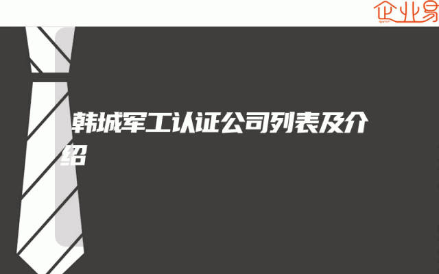 - 韩城军工认证公司列表及介绍一、军工认证概述在当今世界,军工产业是一个国家安全的重要支柱。军工认证作为军工产业的一部分,是保证军工产品质量的重要环节。韩城作为我国军工产业的重要基地,汇聚了一批优秀的军工认证公司。这些公司在确保军工产品