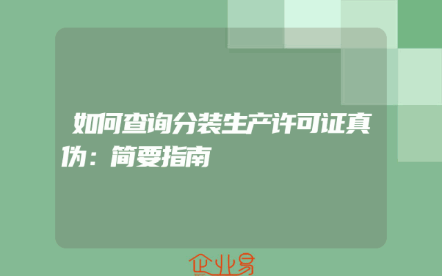 - 如何查询分装生产许可证真伪:简要指南一、了解生产许可证基本知识在生产制造行业,企业的合法运营离不开各类许可证的支持。分装生产许可证是其中重要的一种,确保企业合法从事特定产品的分装生产活动。了解许可证的基本信息,如证件编号、企业名称、