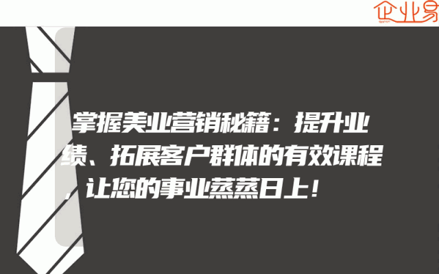- 掌握美业营销秘籍:提升业绩、拓展客户群体的有效课程,让您的事业蒸蒸日上!