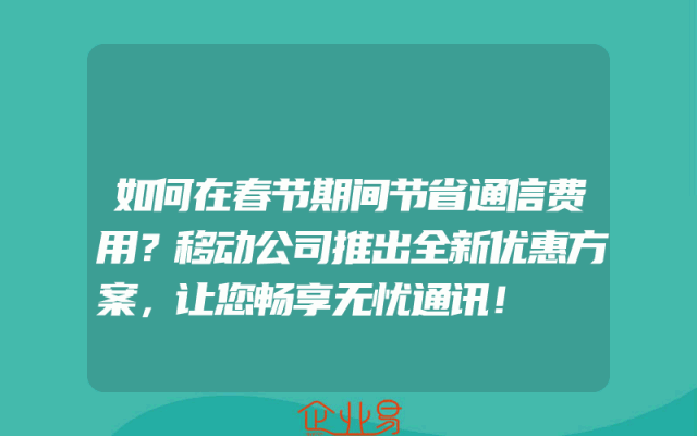 - 如何在春节期间节省通信费用?移动公司推出全新优惠方案,让您畅享无忧通讯!
