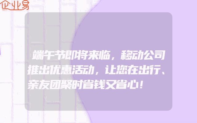 - 端午节即将来临,移动公司推出优惠活动,让您在出行、亲友团聚时省钱又省心!随着端午节的临近,越来越多的人开始计划如何度过这个重要的传统节日。对于许多人来说,出行和与亲友团聚是庆祝端午节的重要方式之一。为了满足广大用户的需求,移动公司推出了一项
