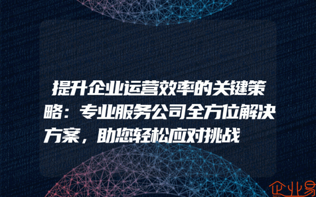 - 提升企业运营效率的关键策略:专业服务公司全方位解决方案,助您轻松应对挑战在当今竞争激烈的商业环境中,提升企业运营效率是每个企业都面临的关键挑战。为了应对这一挑战,许多企业选择与专业的服务公司合作,以获得全方位的解决方案。本文将探讨专业服务公