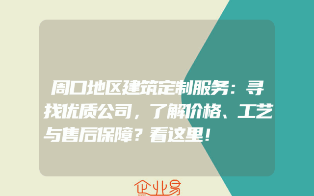 - 周口地区建筑定制服务:寻找优质公司,了解价格、工艺与售后保障?看这里!在周口地区,如果你正在寻找一家提供高质量建筑定制服务的公司,那么你一定需要考虑多个因素,包括价格、工艺和售后服务。下面我们将为你介绍一些值得关注的公司,并帮助你更好地了解