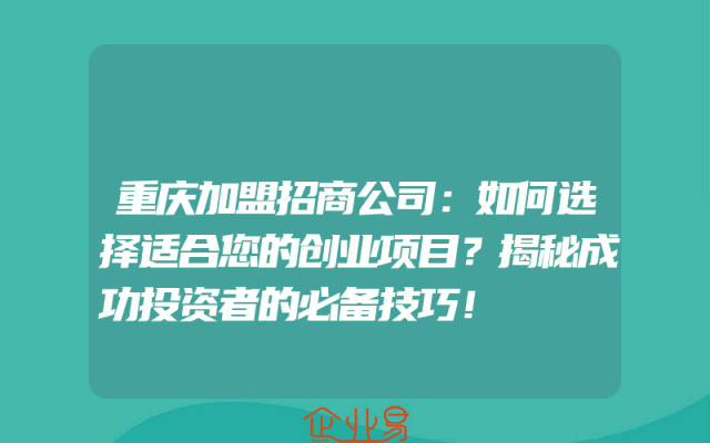 - 重庆加盟招商公司:如何选择适合您的创业项目?揭秘成功投资者的必备技巧!在当今的社会中,创业已经成为了许多人的首选。然而,面对众多的创业项目,我们应该如何选择呢?本文将从重庆加盟招商公司的角度出发,为大家揭秘成功投资者的必备技巧,帮助您找到适
