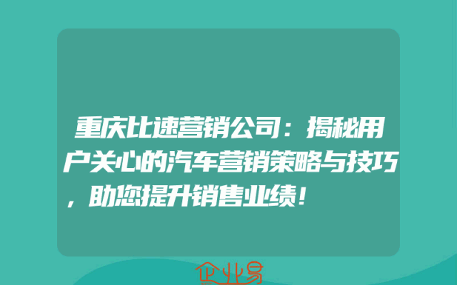 - 重庆比速营销公司:揭秘用户关心的汽车营销策略与技巧,助您提升销售业绩!
