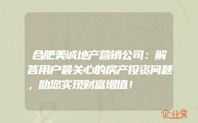 - 合肥美诚地产营销公司:解答用户最关心的房产投资问题,助您实现财富增值!在当今社会,房地产投资已经成为许多人实现财富增值的重要途径。然而,对于许多投资者来说,房产投资仍然充满了未知和困惑。为了帮助广大投资者解决这些问题,合肥美诚地产营销公司专