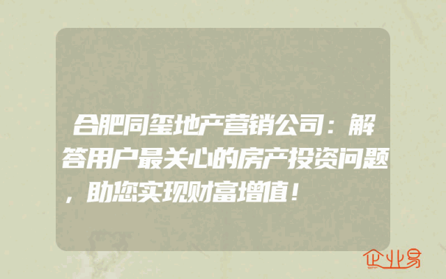 - 合肥同玺地产营销公司:解答用户最关心的房产投资问题,助您实现财富增值!