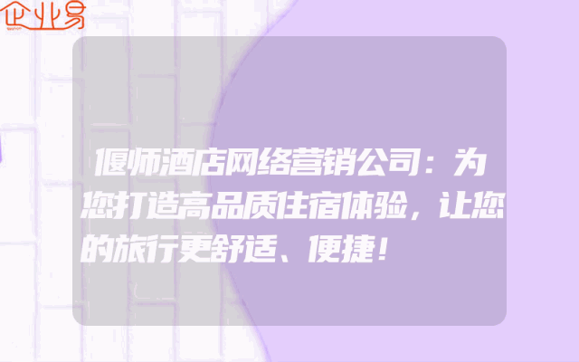 - 偃师酒店网络营销公司:为您打造高品质住宿体验,让您的旅行更舒适、便捷!随着互联网的普及和发展,网络营销已经成为企业拓展市场、提升品牌影响力的重要手段。对于酒店行业来说,网络营销不仅可以帮助酒店吸引更多的客户,还可以提高客户的满意度和忠诚度。