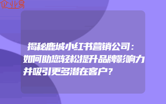 - 揭秘鹿城小红书营销公司:如何助您轻松提升品牌影响力并吸引更多潜在客户?在当今竞争激烈的市场环境中,企业要想在众多的竞争对手中脱颖而出,提升品牌影响力并吸引更多潜在客户是非常关键的。而鹿城小红书营销公司正是一家专注于为企业提供全方位营销解决方