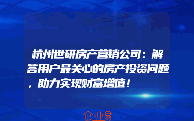 - 杭州世研房产营销公司:解答用户最关心的房产投资问题,助力实现财富增值!