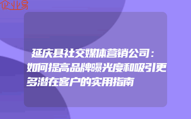 - 延庆县社交媒体营销公司:如何提高品牌曝光度和吸引更多潜在客户的实用指南在当今的数字化时代,社交媒体已经成为企业推广和营销的重要渠道。对于延庆县的社交媒体营销公司来说,如何提高品牌曝光度和吸引更多潜在客户是一个重要的挑战。本文将为你提供一些实
