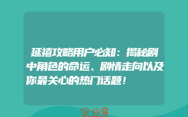 - 延禧攻略用户必知:揭秘剧中角色的命运、剧情走向以及你最关心的热门话题!《延禧攻略》是一部备受瞩目的古装剧,自播出以来就吸引了大量观众的关注。这部剧以其精美的服装、华丽的布景和复杂的人物关系而闻名。在这篇文章中,我们将揭秘剧中角色的命运、剧情