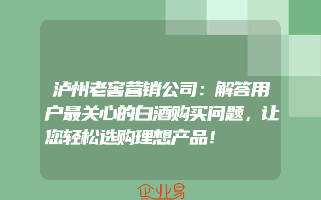 - 泸州老窖营销公司:解答用户最关心的白酒购买问题,让您轻松选购理想产品!