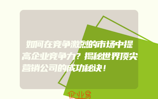- 如何在竞争激烈的市场中提高企业竞争力?揭秘世界顶尖营销公司的成功秘诀!在当今这个竞争激烈的市场环境中,企业要想脱颖而出,提高自身的竞争力是非常重要的。那么,如何才能在众多的竞争者中脱颖而出呢?本文将揭秘世界顶尖营销公司的成功秘诀,帮助您在市