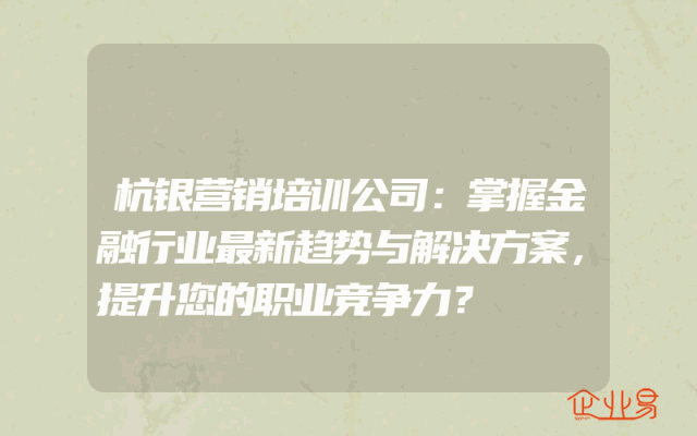 - 杭银营销培训公司:掌握金融行业最新趋势与解决方案,提升您的职业竞争力?