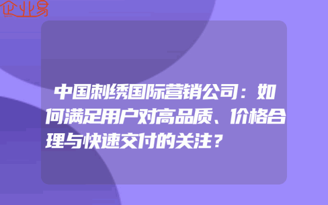 - 中国刺绣国际营销公司:如何满足用户对高品质、价格合理与快速交付的关注?随着全球经济的发展和互联网技术的普及,企业之间的竞争越来越激烈。在这个竞争激烈的市场环境中,如何满足用户对高品质、价格合理与快速交付的关注成为了企业生存和发展的关键。本文