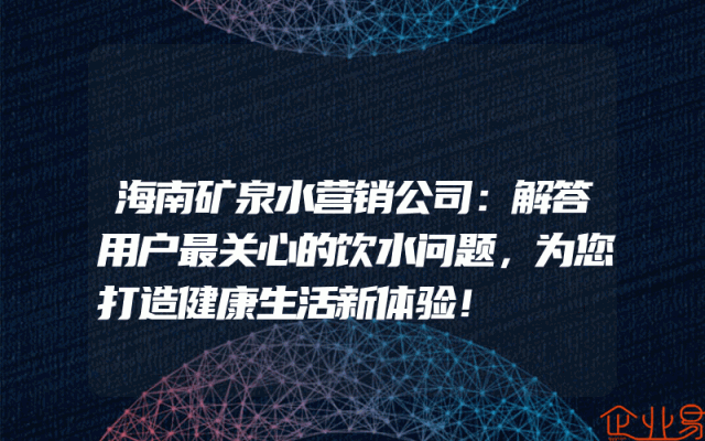 - 海南矿泉水营销公司:解答用户最关心的饮水问题,为您打造健康生活新体验!在当今社会,人们越来越关注健康和生活质量。而饮水作为人体健康的重要组成部分,更是备受关注。海南矿泉水营销公司是一家致力于为用户提供优质饮水解决方案的专业公司。我们深知用户