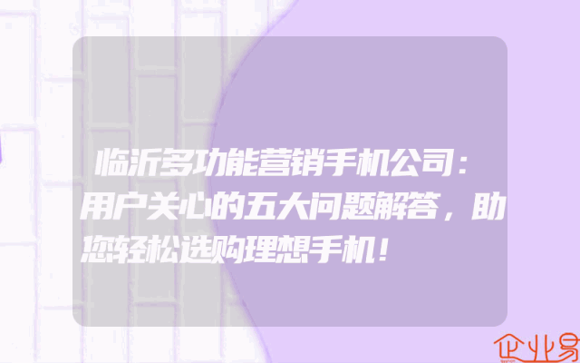 - 临沂多功能营销手机公司:用户关心的五大问题解答,助您轻松选购理想手机!在当今的科技时代,手机已经成为我们生活中不可或缺的一部分。它不仅仅是一种通讯工具,更是一种生活方式的体现。然而,面对市场上众多的手机品牌和型号,消费者往往感到困惑,不知道