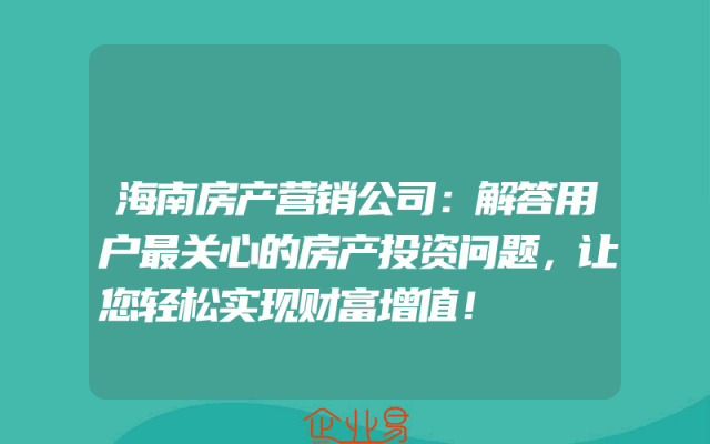 - 海南房产营销公司:解答用户最关心的房产投资问题,让您轻松实现财富增值!