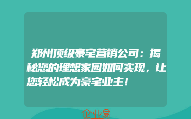 - 郑州顶级豪宅营销公司:揭秘您的理想家园如何实现,让您轻松成为豪宅业主!