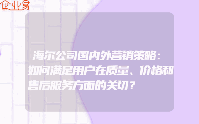 - 海尔公司国内外营销策略:如何满足用户在质量、价格和售后服务方面的关切?随着市场竞争的加剧,企业要想在市场中立足,必须具备一定的营销策略。海尔公司作为一家全球知名的家电品牌,其在国内和国际市场上的营销策略备受关注。本文将从质量、价格和售后服务