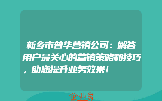 - 新乡市普华营销公司:解答用户最关心的营销策略和技巧,助您提升业务效果!
