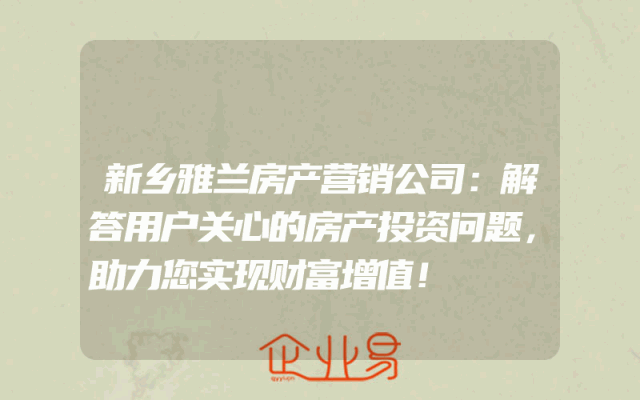 - 新乡雅兰房产营销公司:解答用户关心的房产投资问题,助力您实现财富增值!