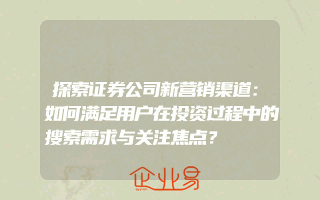 - 探索证券公司新营销渠道:如何满足用户在投资过程中的搜索需求与关注焦点?随着互联网的快速发展,人们的生活方式和消费习惯也发生了翻天覆地的变化。在这个信息爆炸的时代,用户对于各种信息的需求和关注点也在不断地变化。对于证券公司而言,如何满足用户