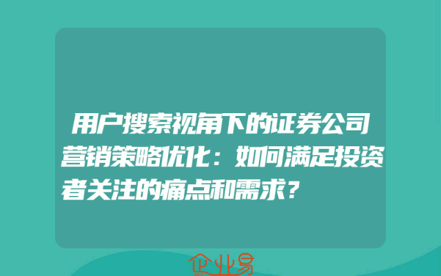 - 引言在当今的金融市场中,证券公司面临着激烈的竞争。为了吸引和留住投资者,证券公司需要不断优化其营销策略。特别是在用户搜索视角下,如何满足投资者关注的痛点和需求,成为了证券公司营销策略优化的关键。本文将从用户搜索视角出发,探讨证券公司如何优化