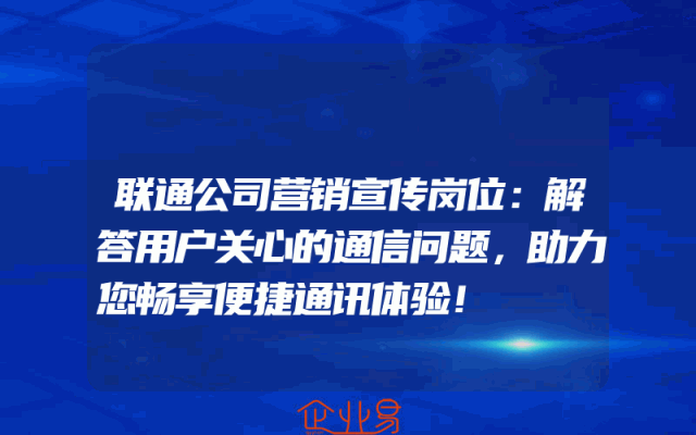 - 联通公司营销宣传岗位:解答用户关心的通信问题,助力您畅享便捷通讯体验!