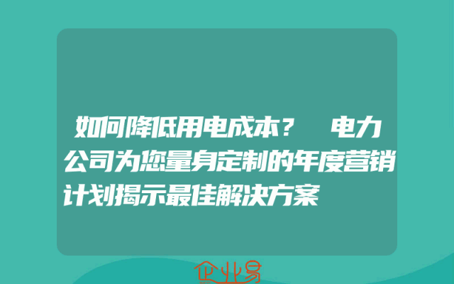 - 如何降低用电成本?在当前的经济环境下,企业的用电成本已经成为了一个重要的财务指标。为了帮助企业降低用电成本,电力公司推出了一份年度营销计划,该计划为企业量身定制,揭示了最佳的解决方案。本文将详细介绍这份计划的内容,以及如何实施这些方案来降低