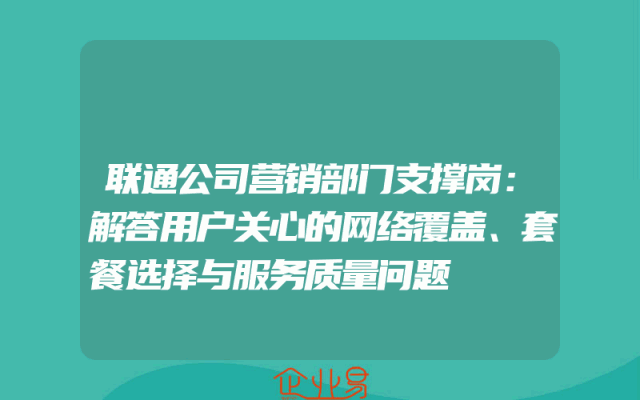 - 联通公司营销部门支撑岗:解答用户关心的网络覆盖、套餐选择与服务质量问题随着科技的不断发展,网络已经成为了我们生活中不可或缺的一部分。作为中国最大的电信运营商之一,中国联通一直致力于为广大用户提供优质的网络服务。在这个过程中,我们营销部门的支