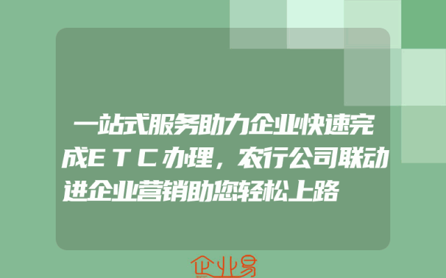 - 一站式服务助力企业快速完成ETC办理,农行公司联动进企业营销助您轻松上路随着科技的发展和交通运输行业的不断进步,电子收费系统(ETC)已经成为了现代交通的重要组成部分。为了方便广大车主,许多银行都推出了ETC办理服务。其中,中国农业银行作为