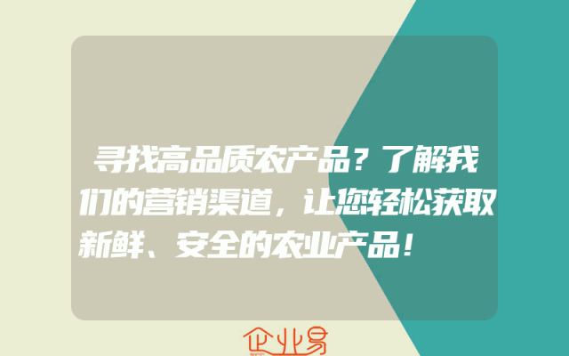 - 寻找高品质农产品?了解我们的营销渠道,让您轻松获取新鲜、安全的农业产品!