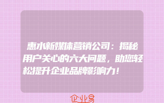 - 惠水新媒体营销公司:揭秘用户关心的六大问题,助您轻松提升企业品牌影响力!随着互联网的普及和发展,新媒体已经成为了企业宣传和推广的重要渠道。然而,企业在进行新媒体营销时,往往会遇到各种问题,如何提升企业品牌影响力成为了企业关注的焦点。本文将为