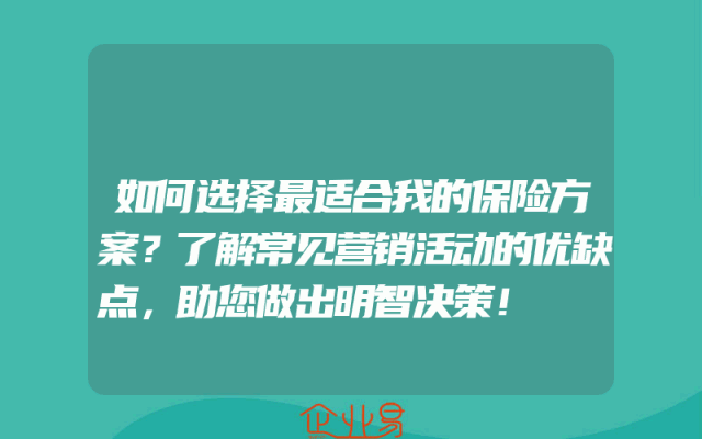 - 如何选择最适合我的保险方案?了解常见营销活动的优缺点,助您做出明智决策!在当今社会,保险已经成为了人们生活中不可或缺的一部分。无论是为了保障自己和家人的生活安全,还是为了应对意外风险,购买保险都是一个明智的选择。然而,面对市场上众多的保险产