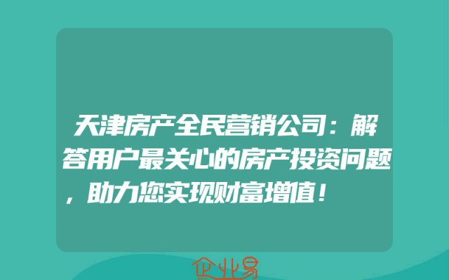 - 天津房产全民营销公司:解答用户最关心的房产投资问题,助力您实现财富增值!