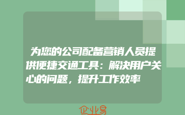 - 为您的公司配备营销人员提供便捷交通工具:解决用户关心的问题,提升工作效率在当今竞争激烈的市场环境中,企业要想取得成功,必须具备高效的营销策略和强大的执行力。而为了实现这一目标,为公司的营销人员提供便捷的交通工具显得尤为重要。本文将从以下几个