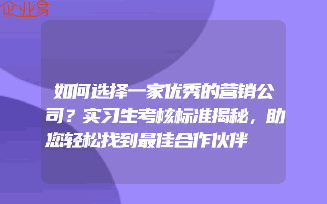 - 如何选择一家优秀的营销公司?在当今竞争激烈的市场环境中,选择一家优秀的营销公司对于企业的成功至关重要。然而,面对众多的营销公司,如何做出最佳的选择呢?本文将为您揭示实习生考核标准,帮助您轻松找到最佳合作伙伴。首先,我们需要明确营销公司的主要