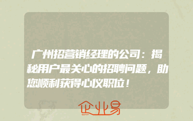- 广州招营销经理的公司:揭秘用户最关心的招聘问题,助您顺利获得心仪职位!在广州,有很多公司正在招聘营销经理。如果你正在寻找这样的职位,那么你可能会关心一些关于招聘过程和职位要求的问题。本文将为你揭示用户最关心的招聘问题,帮助你顺利获得心仪的职
