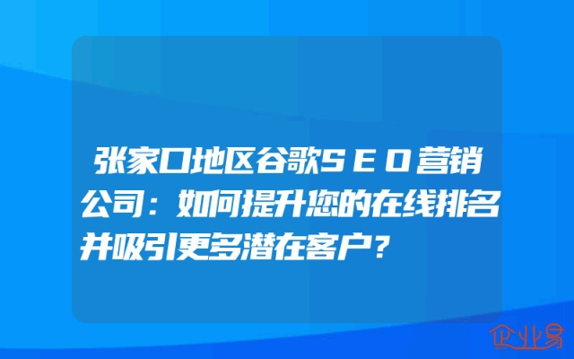 - 张家口地区谷歌SEO营销公司:如何提升您的在线排名并吸引更多潜在客户?