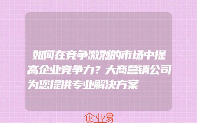 - 如何在竞争激烈的市场中提高企业竞争力?在当今的市场环境中,企业的竞争力显得尤为重要。尤其是在竞争激烈的市场中,如何提高企业的竞争力成为了每个企业都需要思考的问题。大商营销公司作为一家专业的营销服务提供商,我们为您提供了以下的专业解决方案,帮