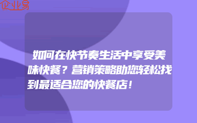 - 在快节奏的生活中,快餐已经成为了许多人的主要食物来源。然而,面对众多的快餐店和各种口味的快餐,如何找到最适合自己的呢?这就需要我们运用一些营销策略来帮助我们。本文将为你提供一些实用的建议,让你在快节奏生活中享受美味快餐的同时,也能找到最适合